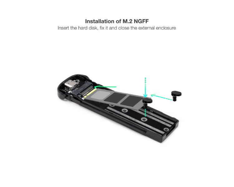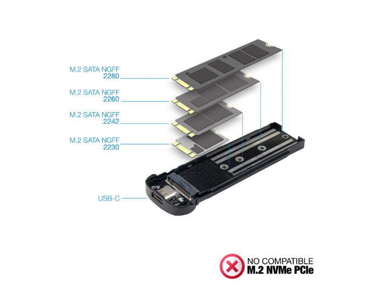 2230, 2242, 2260, 2280/ No compatible con NVMe/ Carcasa de aluminio/ Apertura fácil sin tornillos