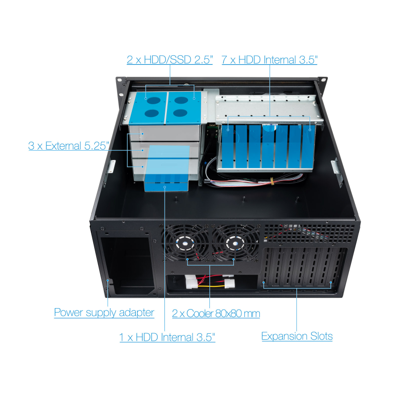 19" 4U/Bahías: 3x5'25 externa / 8x3'5, 2x2'5 internas/ Medida: 485 x 178 x 482 mm
