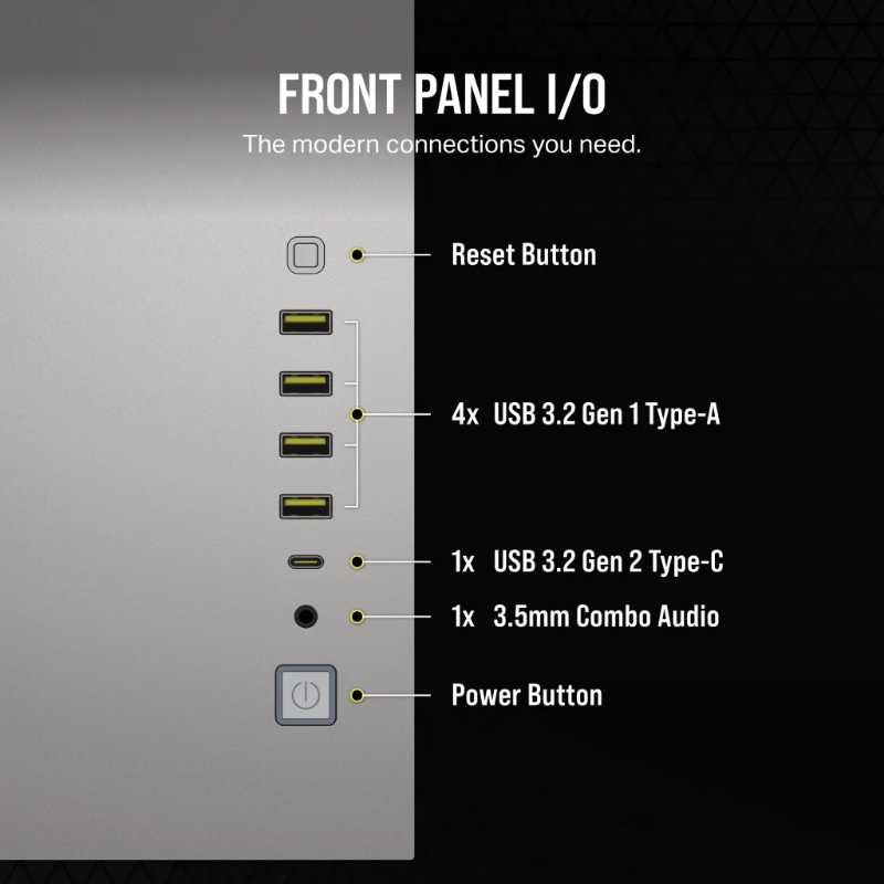 Case Front IO: (1x) USB 3.2 Gen 2 Type-C, (4x) USB 3.2 Gen 1 Type-A, (1x) Audio in/out