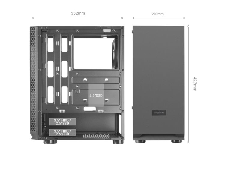 Bahias: Internas: 2 x 3'5, 3 x 2'5 Color Del Producto: Negro Conectores: USB 3.0 x 1, USB 2.0 x 1, Audio, Mic F.A.: No Formato: ATX Formato F.A.: ATX Medidas: 352 x 200 x 427 mm Otros: Sistema De Gestion De Cableado Interno Potencia F.A.: Sin fuente