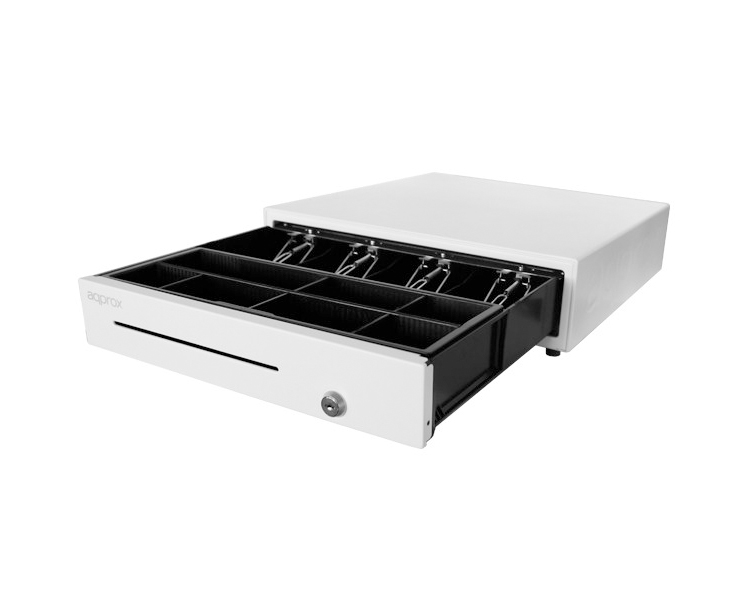Dispone de compartimento de billetes y cajonera de monedas extraíble, ambos totalmente ajustables. Además, incorpora ranura frontal para guardar cheques sin necesidad de abrir el cajón.
