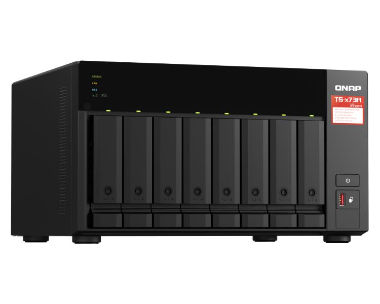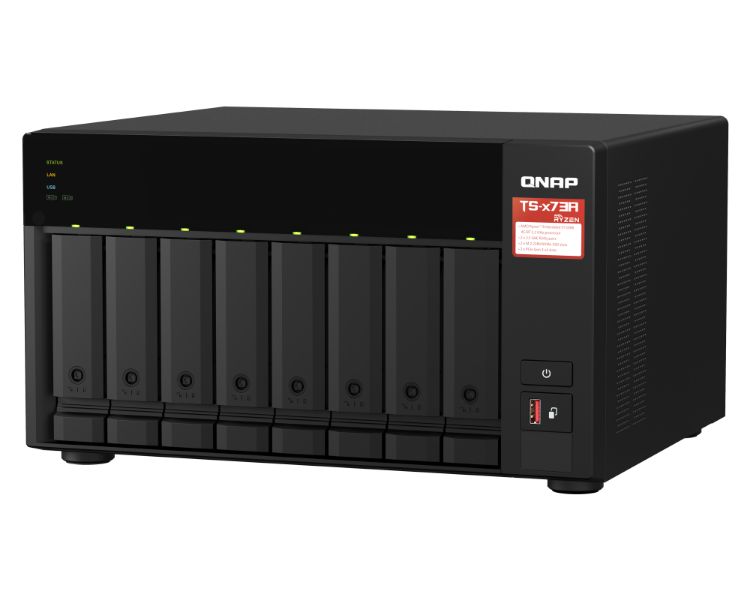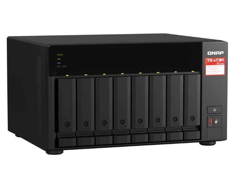 Con un procesador AMD Ryzen™ V1000 serie V1500B de cuatro núcleos que ofrece un gran rendimiento del sistema con un máximo de cuatro núcleos y 8 hilos y Turbo Core hasta 2,2 GHz. El TS-873A incluye dos puertos RJ45 2,5GbE y dos ranuras PCIe Gen 3 para que pueda implementar de forma flexible redes de 5GbE/10GbE. Las dos ranuras para SSD NVMe M.2 para la tecnología Qtier y la caché de SSD permiten una optimización del almacenamiento constante. El TS-873A admite QTS y QuTS hero, lo que permite a los usuarios cambiar de forma flexible entre los sistemas operativos según sus necesidades.
