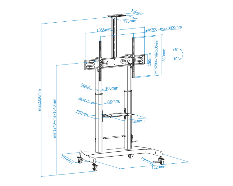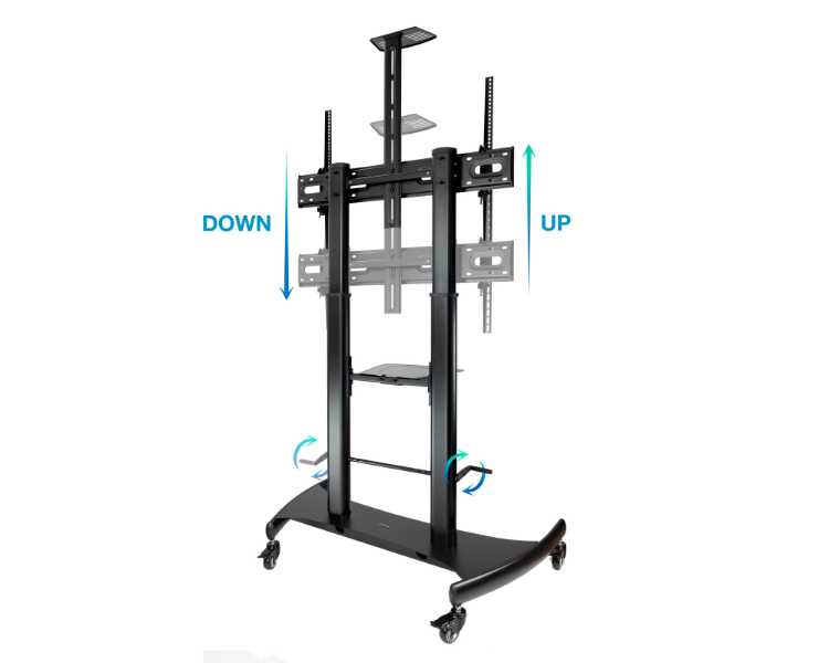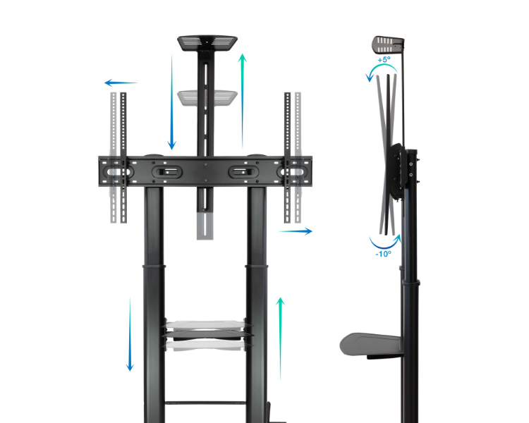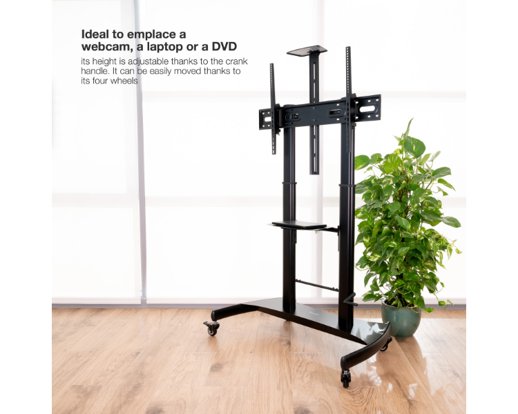 Pantallas de 60 a 100"/ VESA Max 1000x600/ Hasta 100kg/ Bandeja para reproductor DVD/ Altura ajustable/ Ruedas con sistema de bloqueo