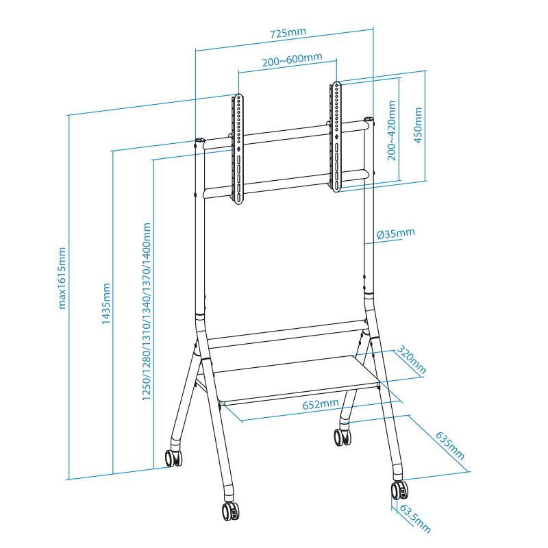 Colocación soporte: Suelo movil Color Del Producto: Negro Peso Maximo: 80kg Pulgadas Desde: 37 Pulgadas Hasta: 86 Tipo Soporte: SUELO Vesa: 600x400