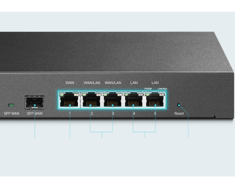Un puerto WAN SFP gigabit, un puerto WAN RJ45 gigabit y dos puertos WAN / LAN libremente intercambiables permiten que el enrutador admita hasta cuatro puertos WAN para satisfacer varios requisitos de acceso a Internet a través de un dispositivo. La función de equilibrio de carga de múltiples WAN distribuye los flujos de datos de acuerdo con la proporción de ancho de banda de cada puerto WAN para aumentar la tasa de utilización de la banda ancha de múltiples líneas.